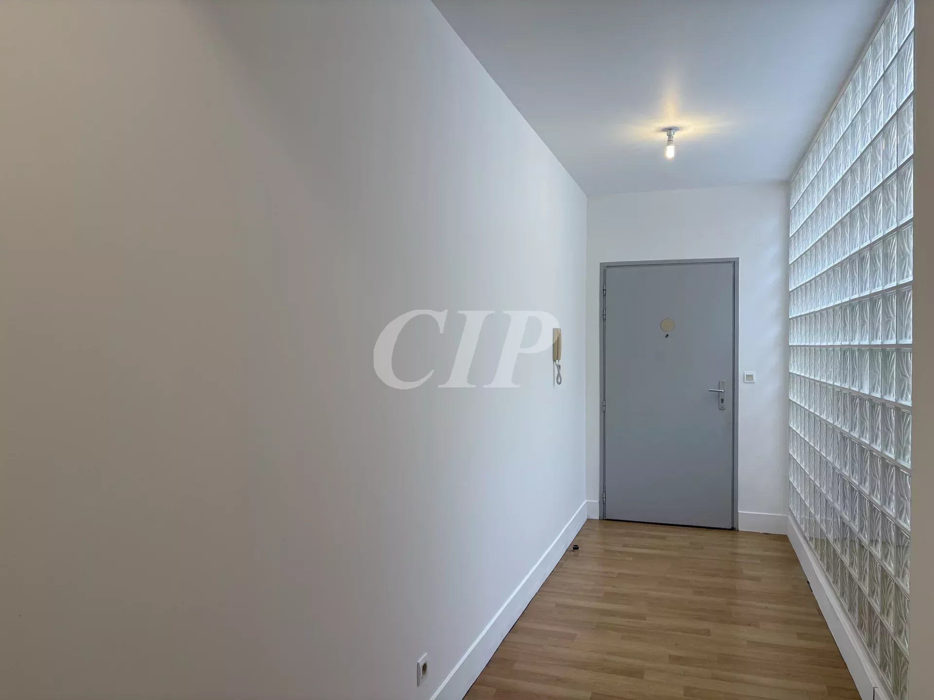 Un appartement aux allures contemporaines, lumineux dés le hall d' entrée avec son mur de verre laissant entrer la lumière naturelle, le couloir mène à un vaste salon avec sa cuisine attenante.